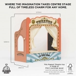 Imaginați-vă că copiii dvs. se pierd într-o lume a fanteziei și poveștilor. Acest teatru de păpuși este realizat din lemn de calitate, cu certificare FSC, și are cortine din țesătură ce adaugă autencitate spectacolului. Decorat cu detalii aurii și include, de asemenea, o fereastră pentru vânzarea de bilete și o tablă pentru a afișa spectacolul. În interior poate fi deschisă o minunată scenă de noapte cu stele, creând o atmosferă magică.