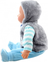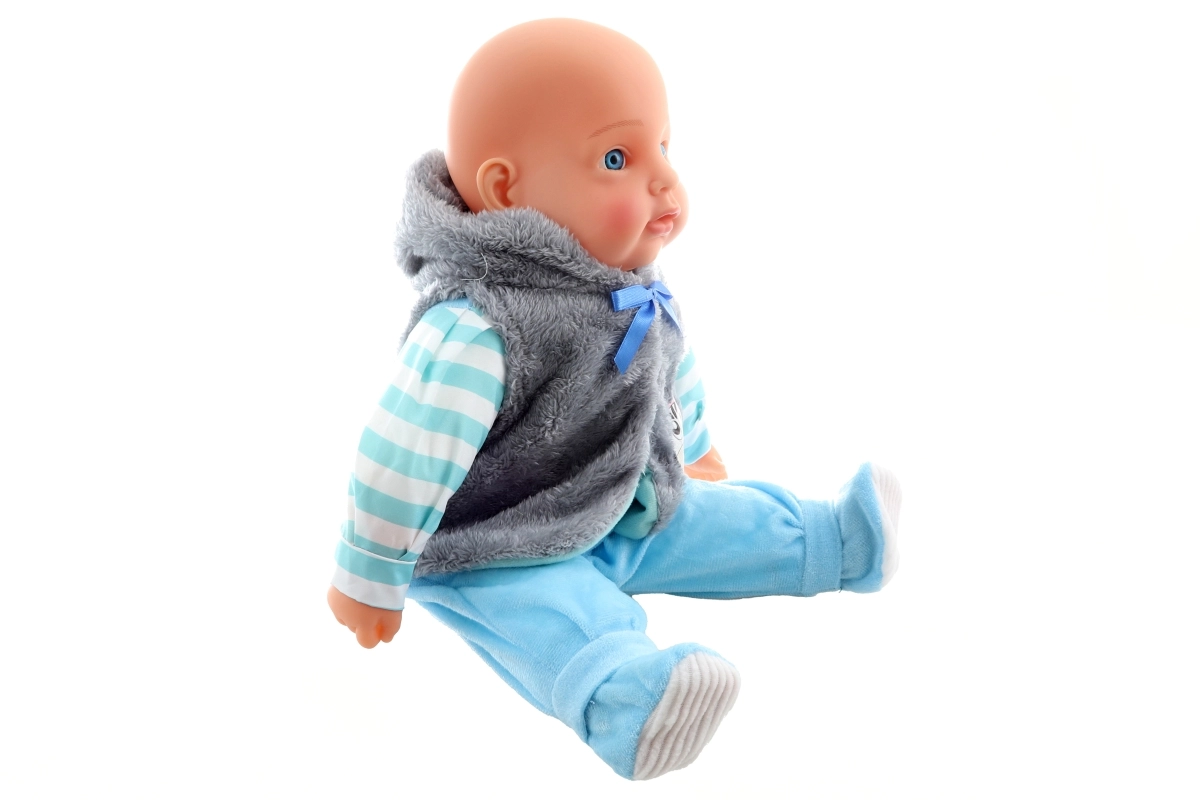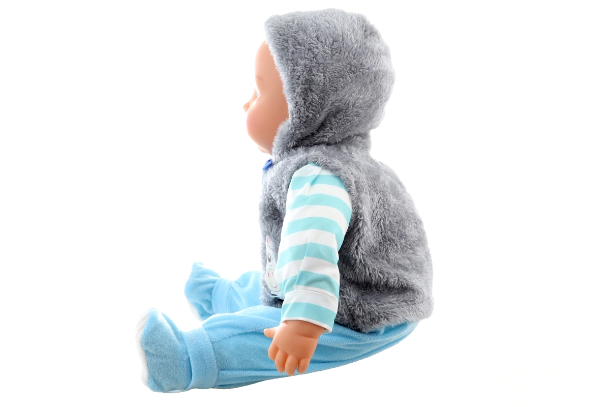 Această păpușă mare – bebeluș băiețel – este concepută pentru un joc autentic de îngrijire. Corpul moale invită la alint, în timp ce capul și extremitățile din plastic oferă păpușii un aspect realist. Datorită tricoului în dungi, pantalonilor albaștri și vestei pufoase, arată ca un bebeluș adevărat pe care copiii adoră să-l îmbrace și să-l țină în brațe.