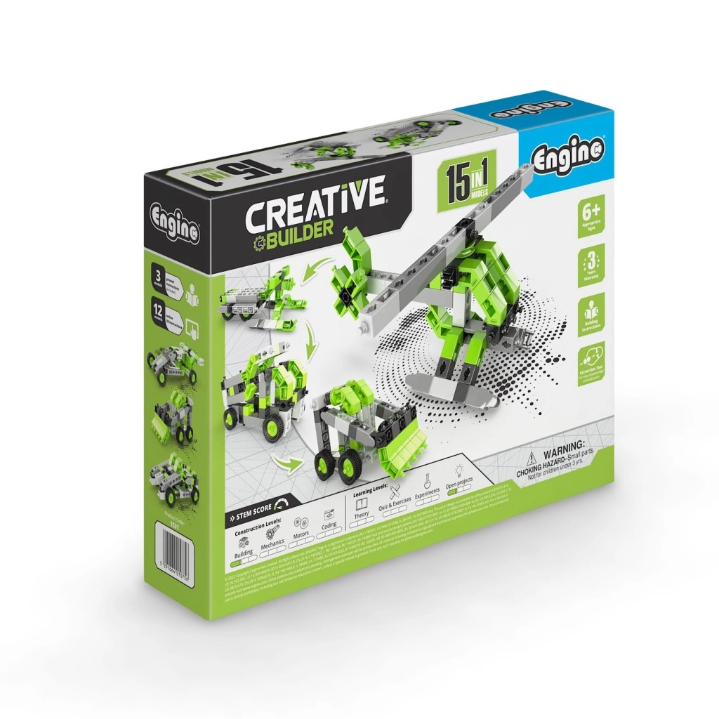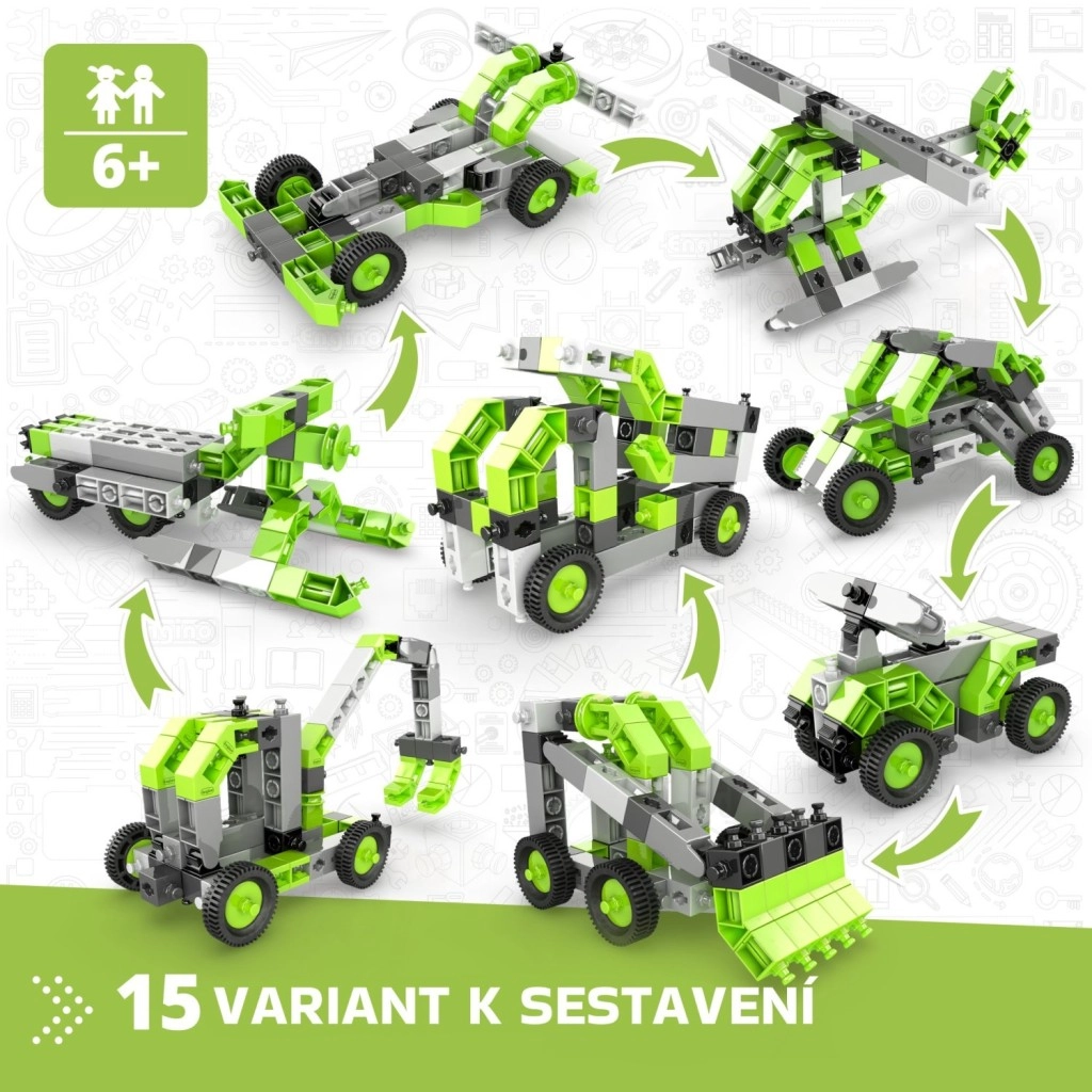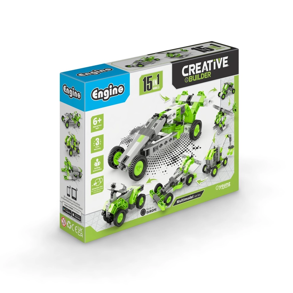 Setul de construcție Engino Creative Builder 15 în 1 oferă copiilor ore întregi de distracție și învățare. Datorită sistemului inteligent de conectori, copiii pot reconstrui cu ușurință o creație în alta și pot experimenta diverse principii mecanice. Aplicația mobilă intuitivă Engino kidCAD în limba cehă afișează modelele în 3D, astfel încât pot fi rotite, mărite și construite pas cu pas.