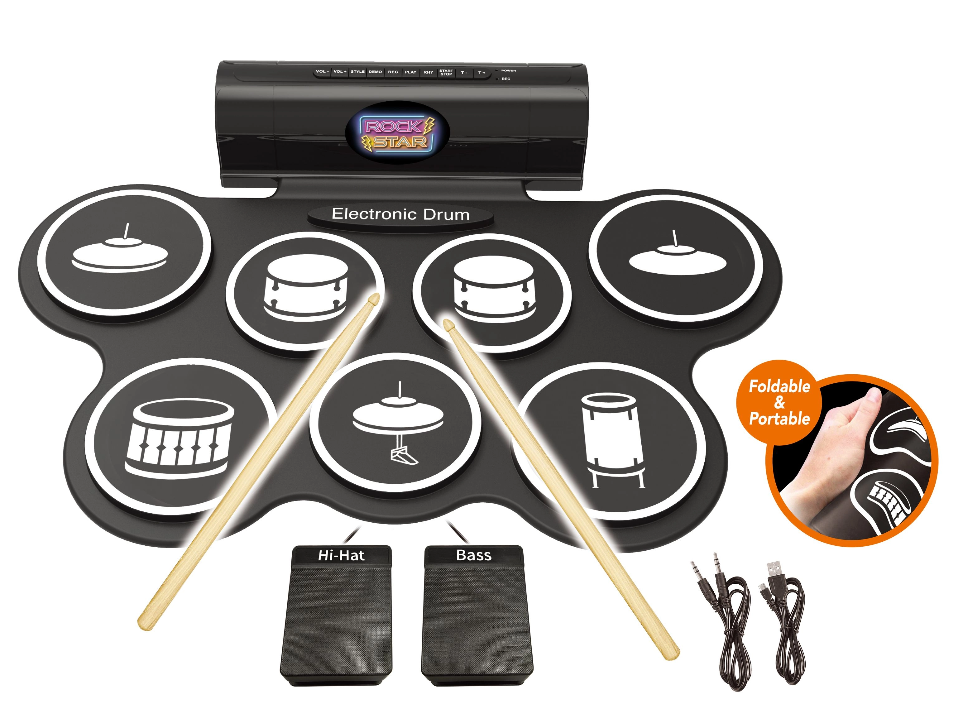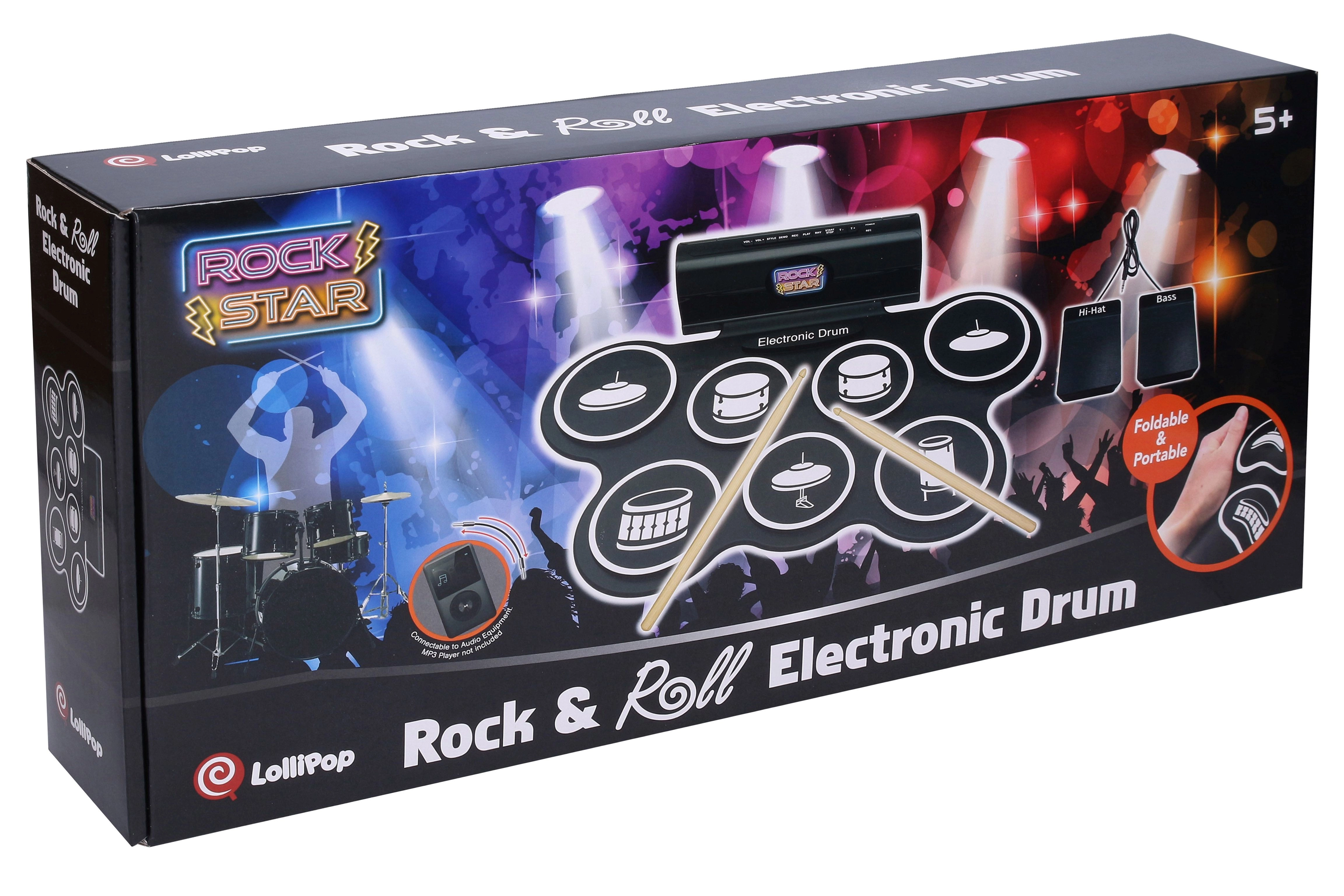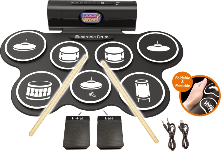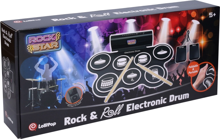 Set compact de tobe electronice pentru cântat acasă și pentru începători, oferă 7 sunete realiste, 2 pedale (hi-hat și tobă bas), efecte luminoase și sonore și posibilitatea de înregistrare și redare. În pachet sunt incluse 3× baterii AA, cablu USB și cablu pentru telefon/mp3.
