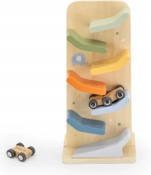 Pista colorată în pantă, cu mașinuță, motivează la joacă repetată, consolidează observația, coordonarea și înțelegerea relației cauză–efect.