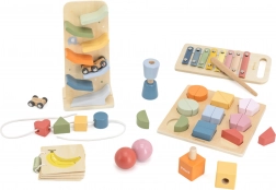 Acest set VIGA atent alcătuit pentru vârsta 18–24 luni reunește jucării din lemn îndrăgite într-un ansamblu armonios. Include un xilofon pentru primele experimente muzicale, o pistă distractivă pentru mașinuțe, puzzle cu forme, piese cu filet, forme de înșirat și o cărticică din lemn cu imagini cu fructe. Fiecare element este conceput pentru a susține dezvoltarea naturală a copilului prin joc.