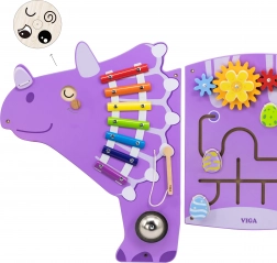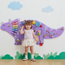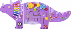 Colorata tablă senzorială de perete din lemn în formă de triceratops de la VIGA TOYS oferă numeroase activități pentru dezvoltarea copiilor. Include un xilofon cu baghetă și un clopoțel/gong, roți dințate rotative, un labirint cu 5 ouă care se deschid (oglindă + dinozauri mici), ochi care își schimbă expresia cu ajutorul unui buton și o buclă motrică captivantă cu lansator de mărgele. Excelentă pentru motricitatea fină, coordonarea mână–ochi și explorarea senzorială.