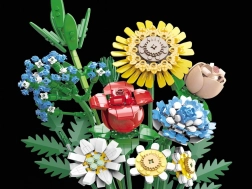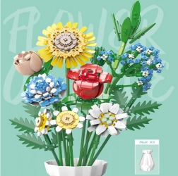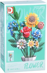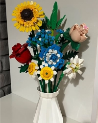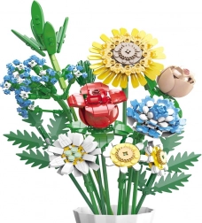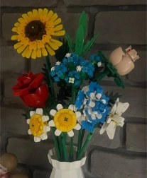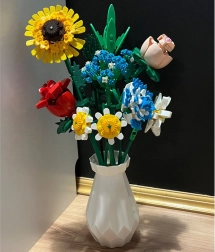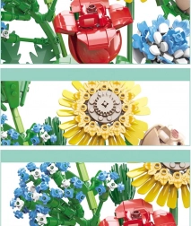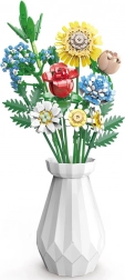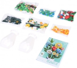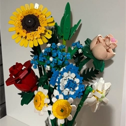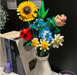 Transformă setul de construcție într-o decorațiune de design. Buchetul colorat din piese de construcție include floarea-soarelui, trandafiri, garoafă, margaretă, crin, „nu-mă-uita” și elemente verzi (frunze de haitong, cedru, iarbă). Este inclus și un elegant flacon crem, astfel încât poți expune imediat buchetul finalizat pe raft sau pe masă.