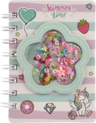 Coperta cu fereastră transparentă plină de confetti și steluțe atrage privirea din prima clipă și oferă carnetului un aspect unic, iubit deopotrivă de copii și adulți.