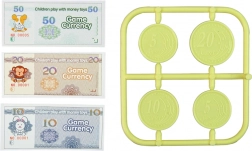 Setul include bancnote din hârtie și monede de plastic, concepute pentru a educa copiii despre educația financiară.