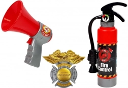 Acest set uimitor de pompier are tot ce are nevoie un mic pompier pentru a salva oameni și animale. Rucsacul este echipat cu elemente reflectorizante galbene și buzunare mici pentru depozitarea echipamentului necesar. Pulverizatorul reîncărcabil manual sub formă de extinctor este un element interactiv minunat, în timp ce megafonul permite anunțarea mesajelor importante. Lanterna portabilă luminează colțurile întunecate și insigna adaugă autenticitate.