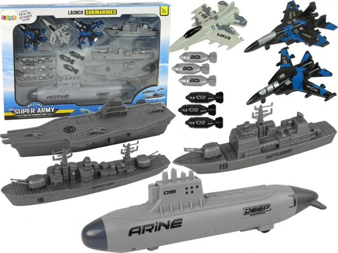 Piesa centrală este submarinul cu lansator mecanic și roți pentru o deplasare fluidă pe podea. Introduceți proiectilul de sus, trageți înapoi partea din spate și lansați – „bombele” din plastic, sigure, adaugă un element de acțiune jocului. Flota este completată de o navă de război, o navă de aprovizionare și un portavion, în timp ce trei avioane de vânătoare oferă sprijin aerian pentru fiecare misiune.