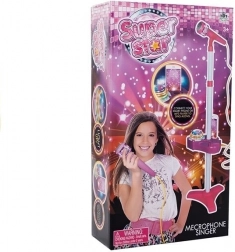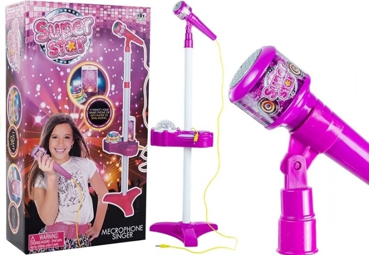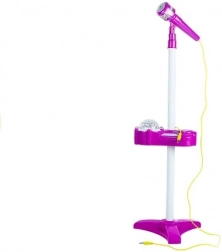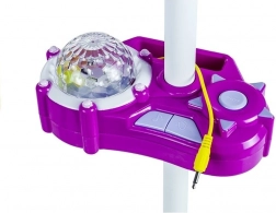 Acest microfon multifuncțional pentru copii pe stativ transformă camera într-o mică scenă muzicală. Panoul interactiv cu difuzor încorporat, butoane pentru schimbarea acompaniamentului și reglarea volumului este completat de un proiector disco magic, care proiectează lumini colorate învârtitoare. Datorită cablului inclus, se poate conecta telefonul sau playerul MP3 și se poate cânta pe propriile melodii.