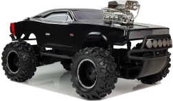 Această mașină RC off-road neagră îmbină aspectul dur de muscle car cu performanțe ridicate pe teren accidentat. Construcția durabilă absoarbe șocurile, iar suspensia de calitate ajută la depășirea denivelărilor, în timp ce roțile late cu profil adânc oferă aderență excelentă pe iarbă, nisip și pietriș.
