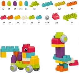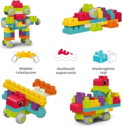 Seturi de construcție moi și sigure pentru cei mai mici, de la 6 luni. Setul include 62 de piese, inclusiv 10 roți pentru construirea de vehicule. Material moale, colțuri rotunjite și posibilitatea de fierbere pentru igienizare susțin dezvoltarea motrică, creativitatea și percepția spațială.