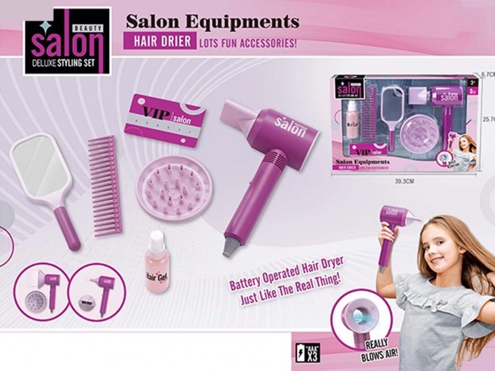 Set de coafură interactivă cu accesorii interschimbabile și uscător de păr pe baterii, ideal pentru copii de la 3 ani, aduce bucurie jocului și dezvoltă creativitatea.