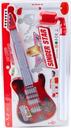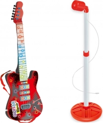 Transformă camera copilului într-o scenă. Chitara roșie, stilată, cu microfon pe stativ aduce efecte luminoase distractive și mai multe moduri muzicale, astfel încât copiii pot cânta la chitară, pot cânta la microfon sau pot face ambele în același timp. Controlul ușor și funcționarea fără fir pe baterii asigură joaca confortabilă și sigură.