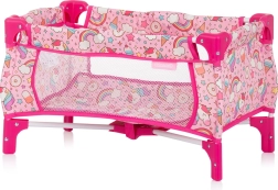 Cadru stabil și textile de calitate cu motiv de unicorni. Laterale din plasă la pătuț pentru o supraveghere mai bună și scaun confortabil pentru hrănirea păpușilor, pentru un joc sigur.