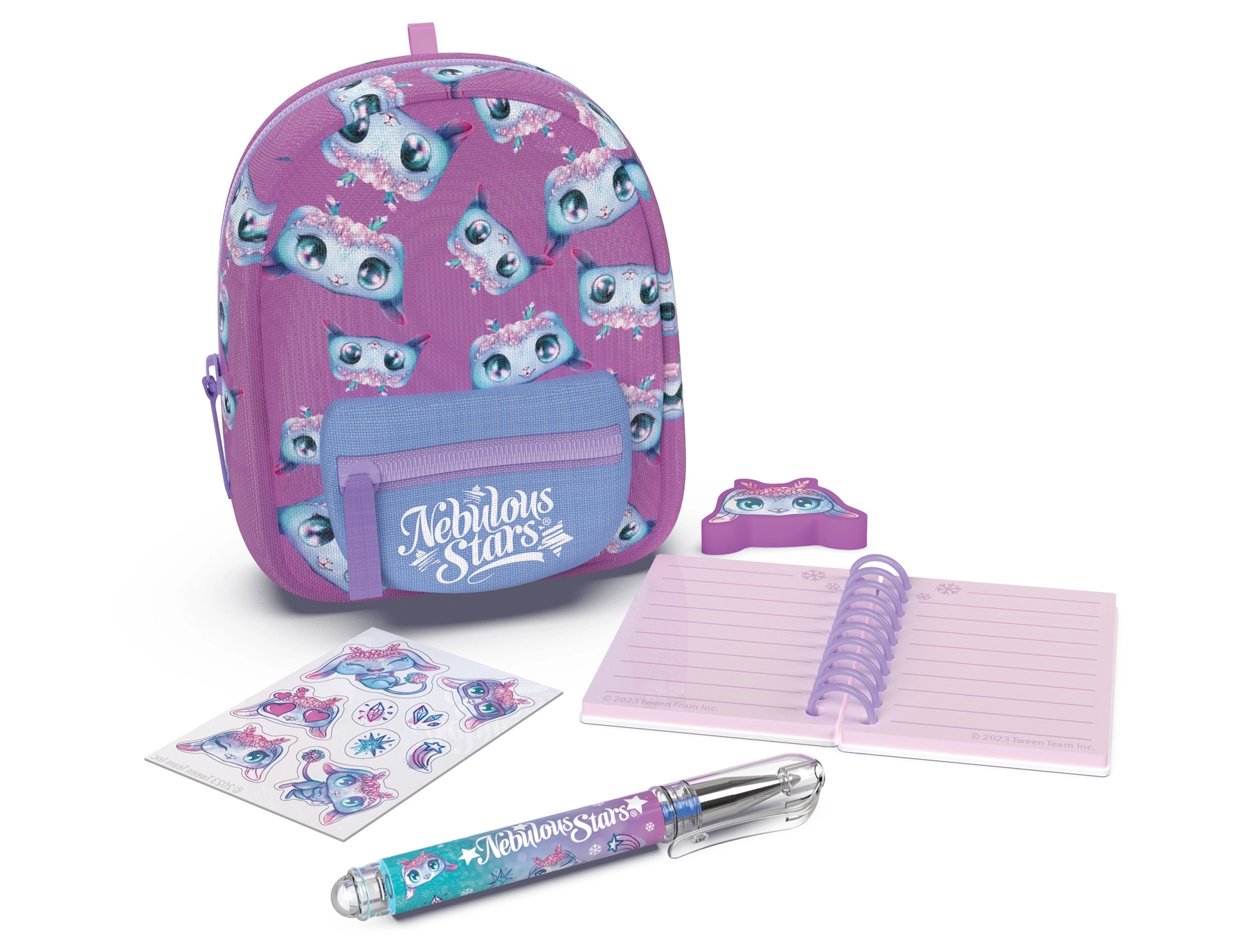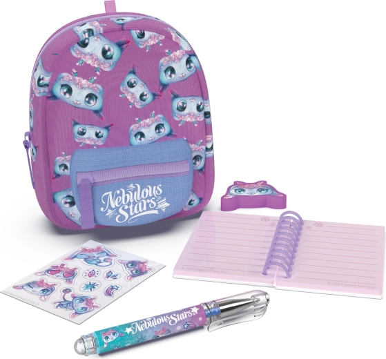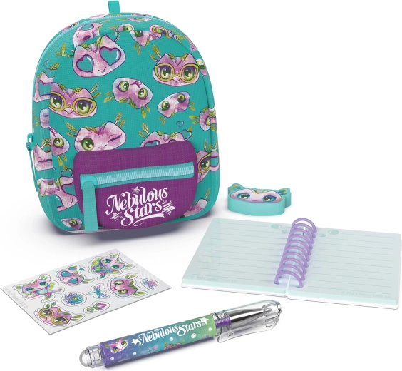 Stilatul mini rucsac NEBULOUS STARS cu set de papetărie este ideal pentru micii iubitori de creație și pentru călătorii. În formatul compact 9 × 6 × 11 cm ascunde tot ce este necesar: caiet liniat, pix, gumă, autocolante și un drăguț breloc. Disponibil în 3 variante de culoare – albastru, alb și mov.