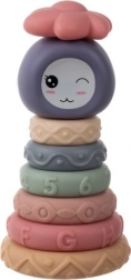 Asamblează un turn colorat cu căpșor de pisicuță și o pălărioară în formă de floare. Cele șase inele pastelate, cu suprafețe diferite, invită la explorare, strângere și înșiruire. Unele piese scot sunete când sunt apăsate, stimulând auzul și consolidând relația cauză–efect.
