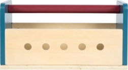 Ciocanul, cheia și șurubelnița din lemn sunt completate de șuruburi, piulițe și piese perforate – totul pentru antrenarea motricității fine și a imaginației.