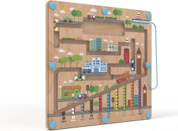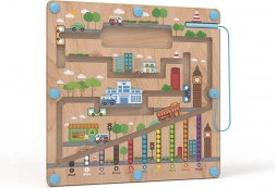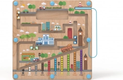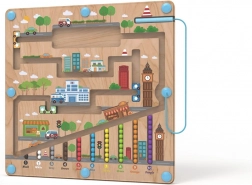 Placa de joc magnetică cu tematică urbană oferă copiilor de la 2 ani o activitate captivantă, în care, cu ajutorul indicatorului magnetic, mută bilele pe traseele marcate. Baza solidă din lemn este acoperită cu o placă transparentă din plastic, astfel încât bilele sunt în siguranță și nimic nu se pierde.