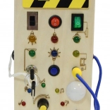 Descoperă lumea electricității și a cauzei‑efect cu această placă interactivă din lemn. Oferă o serie de activități precum comutatoare, lumini LED, cheie cu încuietoare și priză cu fișă, care dezvoltă motricitatea fină, coordonarea mână–ochi și curiozitatea. Placa este distractivă și educativă, luminile se aprind treptat sau simultan și sunt însoțite de sunete. Necesită 2× baterii AAA (neincluse).