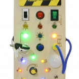 - Comutatoare, butoane, cheie cu încuietoare, priză cu fișă, lumini LED colorate, efecte sonore