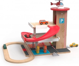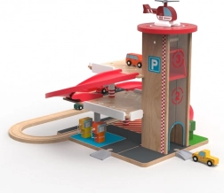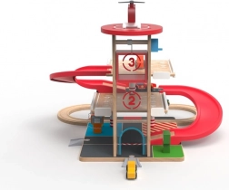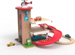 Acest garaj din lemn de calitate, cu pistă de tren, oferă trei niveluri de parcare, lift funcțional cu acționare prin manivelă și heliport pe acoperiș. Copiii pot alimenta la pompe la parter, pot ridica mașinuța cu liftul și o pot lansa pe rampa spiralată roșie înapoi în jos, unde se continuă lin pe șine. Materialele durabile și detaliile bine gândite asigură o durată lungă de viață și joacă în siguranță.