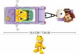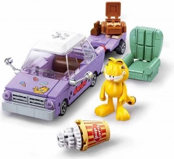 Construiește o mașină mov cu detaliu „Garfield” pe lateral și atașează remorca cu accesorii tematice – ideală pentru joacă și expunere.