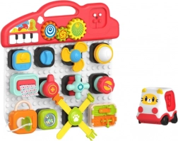 - Panou interactiv: Panou universal la care pot fi atașate diverse elemente educative și senzomotorii, permițând asamblarea creativă.