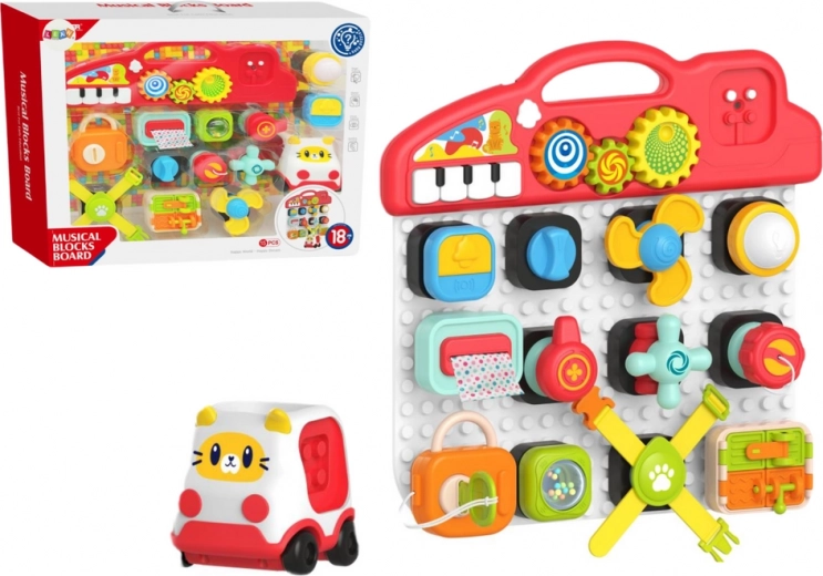 - Mâner portabil și pian: Partea superioară a panoului este echipată cu un mâner practic pentru transport facil și include 4 clape de pian cu melodii, care stimulează auzul și susțin interacțiunea.