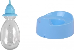 Echipare completă pentru îngrijirea păpușii: biberon transparent și oliță albastră pentru exersarea igienei și scenete distractive.