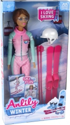 Păpușa Anlily este o păpușă frumos decorată, care seamănă cu un schior real. Are părul lung, castaniu și poartă o cască albă pentru o plimbare sigură pe schiuri, completată de ochelari colorați stilat. Este îmbrăcată într-un costum de schi roz cu detalii verzi contrastante și cizme albe de schi, care se potrivesc perfect cu setul ei.