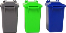Setul include trei găleți de plastic colorate, care ajută la învățarea sortării diferitelor tipuri de deșeuri.