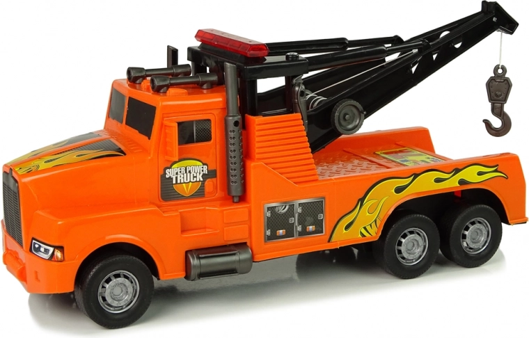 Pornește acțiunea de salvare cu mașina de tractare din plastic, portocalie, cu flăcări stilizate. Macara rotativă, cablu extensibil și troliu manual permit să „tractezi” cu ușurință alte jucării către un loc sigur. Mecanismul cu întoarcere adaugă viteză și un plus de distracție.