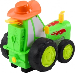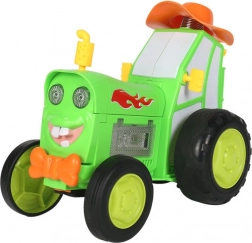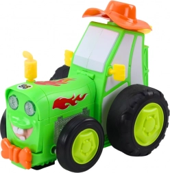 Tractorul verde amuzant cu telecomandă oferă copiilor ore de distracție plină de acțiune. Poate merge înainte/înapoi, vira și, la apăsarea a două butoane, execută un truc acrobatic pe două roți. În timpul mersului luminează și redă o melodie veselă, dezvoltând motricitatea și coordonarea. Potrivit de la 3 ani.