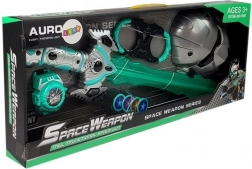 Sabia cu lumină creează efecte sonore și luminoase ca în adevăratele lupte spațiale. Încercați-o pe întuneric! Setul conține, de asemenea, o mască, datorită căreia micul vostru luptător va arăta ca un veritabil războinic spațial. Întregul set este în culori negru-argintiu-turcoaz. Lansatorul de discuri și cătușele ajută la capturarea adversarului.