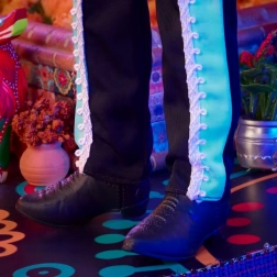 Impresionați cu broderiile de cranii dulci, flori și oase care decorează costumul și accesorii precum cureaua și pantofii.