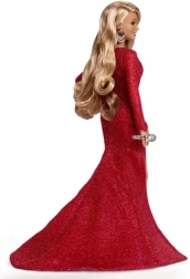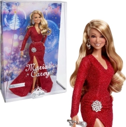 Păpușa Barbie Mariah Carey poartă o rochie roșie strălucitoare, care completează decorul de iarnă. Detalii precum volanele laterale și despicătura îndrăzneață adaugă eleganță. Părul său buclat și accesoriile argintii, alături de pantofii roșii, completează stilul său distinctiv.