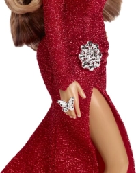 Această păpușă de colecție strălucește într-o rochie roșie sclipitoare cu detalii deosebite, cum ar fi o despicătură înaltă și accesorii elegante.