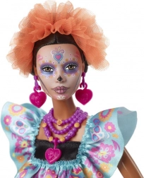 Cu această păpușă unică Barbie din ediția Dia de Muertos 2024, puteți aduce atmosfera acestei sărbători speciale direct la voi acasă. Păpușa este îmbrăcată într-o rochie sofisticată care combină o fustă neagră din satin cu un corset albastru drapat și o curea roz-oranj înfundată. Aceste rochii sunt decorate cu broderii bogate cu motive de oase, flori și cranii de zahăr.