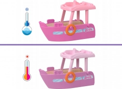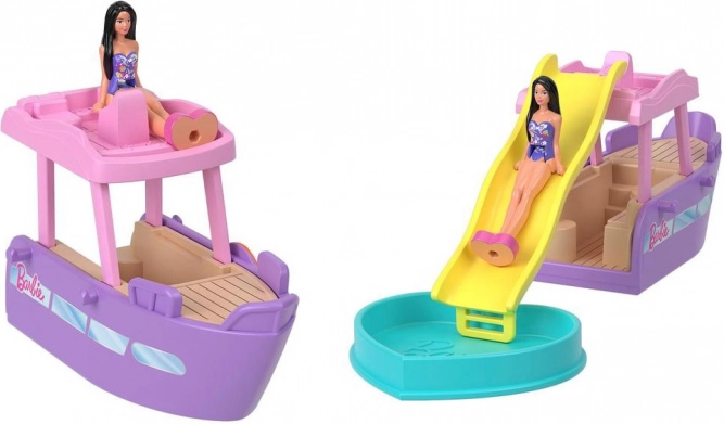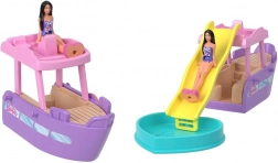 Acest set de joacă colorat aduce copiilor de la 4 ani mini aventuri pe apă la îndemână. Barca în tonuri roz-mov are punte superioară cu locuri, o cabină și poate fi desfăcută într-o configurație de joacă cu tobogan galben intens și piscină turcoaz în formă de inimă. Include o mini păpușă în costum de baie, pregătită pentru o croazieră de vacanță.
