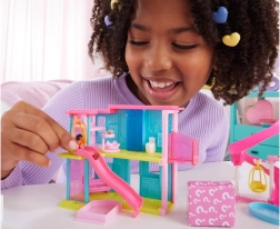 Intrați în lumea fermecată MINI BARBIE LAND cu o căsuță colorată pe două niveluri, mini păpușă și animăluț. Setul aduce joacă creativă, surprize în pachet și o mulțime de funcții: lift, piscină cu tobogan și cocon-hamăc. Datorită dimensiunilor compacte este ideal atât pentru călătorii, cât și pentru camera copiilor.