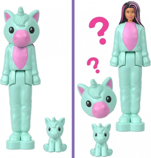 Ridică gluga costumului și descoperă coafura, trăsăturile feței și ținuta MINI BARBIE. Fiecare păpușă este diferită – ideală pentru colecționare și schimb.