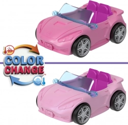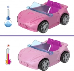 Mașinuța, după scufundare în apă rece, își schimbă culoarea, iar în apă caldă revine la cea inițială – efectul poate fi repetat iar și iar. Datorită dimensiunii, setul se transportă ușor și este un cadou grozav și un plus la colecție. Combinați cu alte seturi Mini Barbie Land și creați-vă propriul mini orășel.