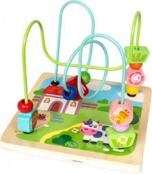 - Labirint: Pe una dintre laturile cubului se află un labirint cu mărgele glisante. Copiii pot deplasa mărgelele pe trasee sinuase, ceea ce contribuie la dezvoltarea motricității și a coordonării mână-ochi.