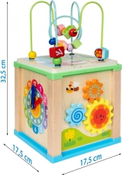 Cubul activ din lemn este o jucărie educativă multifuncțională, care oferă o varietate bogată de activități interactive și stimulative. Fabricat din lemn de înaltă calitate, combină diverse elemente educative, precum labirint, ceas, puzzle și alte atracții, care ajută la dezvoltarea abilităților motorii, a coordonării și a gândirii logice.
