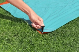 Toboganul se instalează ușor – este nevoie doar să conectați adaptorul la furtunul de grădină și sunteți gata de acțiune. Bucurați-vă de alunecări solitare sau schimbați pozițiile cu prietenii. La marginile toboganului sunt amplasate pernițe pentru controlul apei de duș, care permit interacțiunea între tobogane.