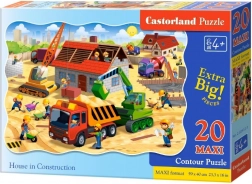 Puzzle colorat pentru copii cu motivul unei case în construcție, care include 20 de piese maxi mari, ideale pentru mâinile mici. Odată asamblat, formează o imagine de 59 × 40 cm. Realizarea de calitate și culorile intense susțin concentrarea, răbdarea și dezvoltarea imaginației copiilor.