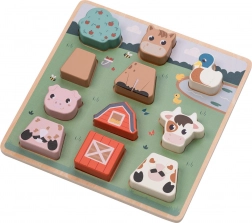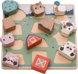Acest puzzle de încastrat din lemn, pe o bază solidă, îi va încânta pe toți micii iubitori de animale. În timp ce se joacă, copiii învață să recunoască forme și culori, își exersează răbdarea și gândirea logică și, totodată, își dezvoltă motricitatea fină și coordonarea ochi–mână. Piesele cu animale se pot introduce cu ușurință în placă și pot fi folosite și individual în jocul liber.