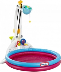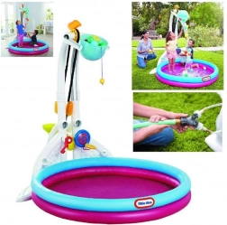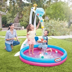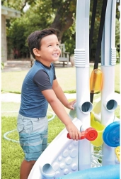 Descoperă centrul acvatic multifuncțional care transformă orice grădină sau cameră de copii într-un loc plin de bucurie. Copiii pot regla debitul apei, umple recipientul de pulverizare, porni cascada dublă și privi cum mingile se rostogolesc pe transportorul de apă/bile în găleata superioară. Baza gonflabilă sporește siguranța și confortul în timpul jocului.