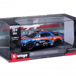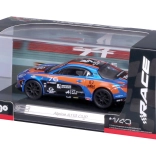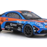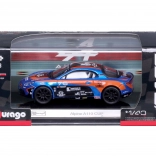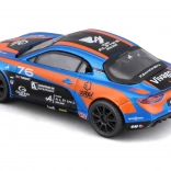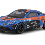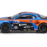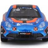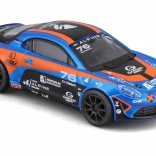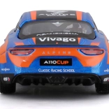 Model detaliat al mașinii de curse Alpine A110 Cup, cu livery iconic albastru‑portocaliu, proporții realiste, inscripții ale sponsorilor clare și roți care se rotesc liber pentru rulare fluentă. Geamurile ușor fumurii, farurile modelate și silueta aerodinamică subliniază caracterul sportiv al originalului.