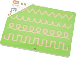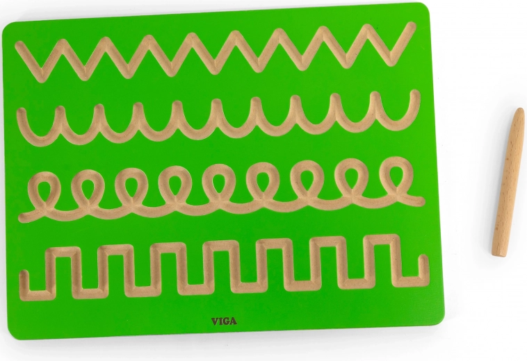 Această tablă compactă din lemn este concepută pentru exersarea intuitivă a trasărilor și direcțiilor pe care copiii le folosesc la desen și scriere. Cu stiloul din lemn inclus, copilul parcurge zigzaguri, bucle și arcuri, întărind priza corectă și fluența mișcărilor.
